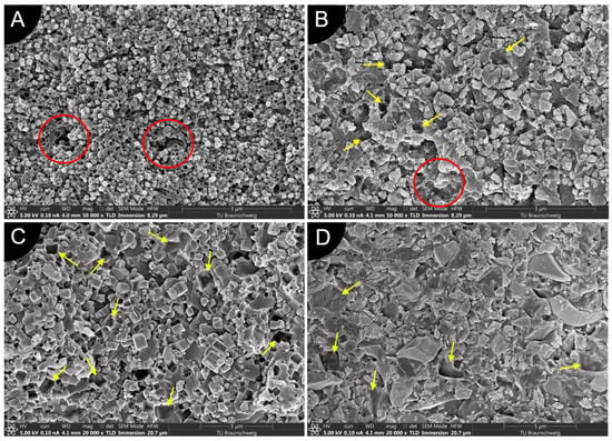 SEM images of cross-sections of solidified piezoelectric composites made with 30 vol.% of (A) BTO (magnification ×50,000), (B) KNN7 (magnification ×50,000), (C) KNN3.5 (magnification ×20,000), or (D) PZT (magnification ×20,000). Red circles show voids without particles and yellow arrows indicate places of missing particles dropped during composite breakage.