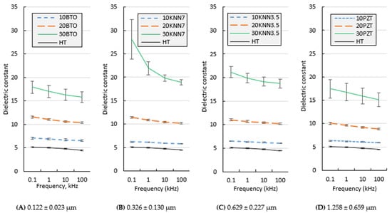 Dielectric constant values (relative permittivity) at different frequencies at room temperature for piezoelectric composites filled with (A) BTO, (B) KNN7, (C) KNN3.5, or (D) PZT.