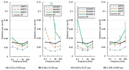 Dielectric loss (dissipation factor tan (δ)) values at different frequencies at room temperature for piezoelectric composites filled with (A) BTO, (B) KNN7, (C) KNN3.5, or (D) PZT.