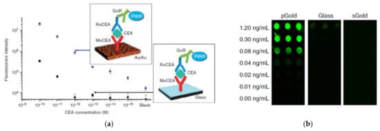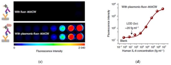 - Tabakman, S.M.; Lau, L.; Robinson, J.T.; Price, J.; Sherlock, S.P.; Wang, H.; Zhang, B.; Chen, Z.; Tangsombatvisit, S.; Jarrell, J.A.; et al. Plasmonic substrates for multiplexed protein microarrays with femtomolar sensitivity and broad dynamic range. Nat. Commun. 2011, 2, 466. [Google Scholar] [CrossRef]