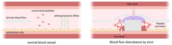 | Diameter/thickness of metal | Thin metal stent (<100 μm) → less blood flow distrubance that reduce the risk of stent malapposition and evaginations Thick metal stent (>100 μm) → generation of circulatory blood flow and promote platelet activation | [271,276] |