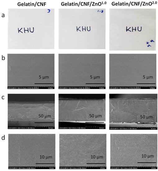 The apparent image of the fabricated films is shown in Figure 1. The pure gelatin/CNF film is transparent and compatible due to the crosslinking interaction between the gelatin and cellulose [26]. The integration of ZnONP did not much change the appearance in the film. The film’s microstructure is also shown in Figure 1. All the fabricated films are intact without any pores. The surface image of pure film shows good compatibility between gelatin and CNF. Similar morphology results have also been observed in previously reported gelatin/CNF-based films [19]. The blending of ZnONP in the polymer matrix shows good dispersion of nanofillers. The cross-section microstructure of the film also showed good distribution of ZnONP; notably, there was no obvious accumulation of nanoparticles in the blend polymer mixture. Thus, the nanofillers reinforced fabricated film was well in shape and structure, which is expected to improve the physical properties of the film.
