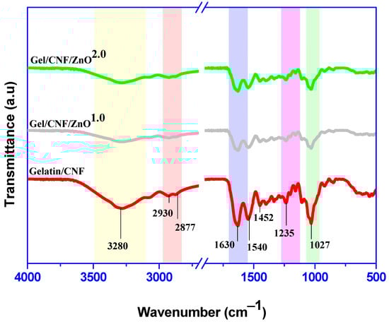 FTIR spectra of the fabricated film are shown in Figure 3. The FTIR data showed the chemical interaction between the two matrices and fillers. The major chemical group observed in the FTIR spectra are 3280 (-OH), 2930 & 2877 (-C-H), 1630 (-CO-NH), 1540 (-N-H), 1452 (-C-N), 1235 (-N-H) and 1027 (-C-O-C) cm−1 [32,33,34]. In the FTIR spectra peak for both gelatin (amide (1540, 1235 cm−1), peptide (1630 cm−1)) and cellulose molecules (pyranose (1027 cm−1)) [19]. The induction of ZnONP did not show the formation of a new peak or noteworthy chemical shift in peak position, but there were minor changes in peak position or intensity (3280, 1630, 1235, 1027). The minor changes in the FTIR pattern could be due to the H-bonding and other physical interactions [19]. In the case of ZnONP integrated CNF-based films, a similar result was reported previously [22]. XRD analysis of the nanocomposite film is presented in the Supporting Information.