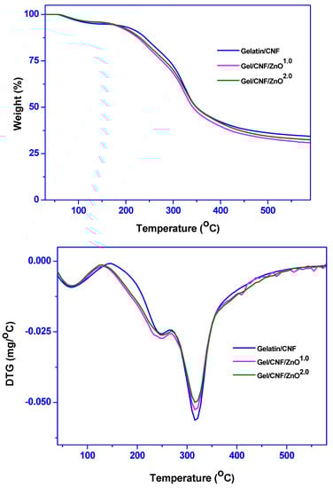 The TGA and DTG thermograms of the films are presented in Figure 4. A three-step weight loss was observed in the DTG data, in which the first maximum weight loss appeared around ~70 °C due to the evaporation of moisture [35]. The second maximum weight loss occurred at ~225 °C, presumed to be the degradation of glycerol and low molecular weight protein [16,35]. The last and major maximum weight loss was detected at ~310 °C owing to the degradation of cellulose and high molecular weight proteins of gelatin [36]. The 50% thermal degradation of all the films was at 345–350 °C, and the presence of ZnONP did not significantly impact the half degradation. From the thermal degradation pattern, it was seen that the addition of nanofiller did not much change the thermal stability of the film. The final non-ignitable residue was found to be 30–34%, and interestingly the char amount was slightly lower in the case of nanocomposite films. Analogous thermal degradation behavior was reported in the case of sulfur nanoparticles reinforced gelatin/CNF-based nanocomposite film [19]. In an earlier report, it has also been shown that the blending of ZnONP did not much influence the thermal stability of bio-based films [12,22].