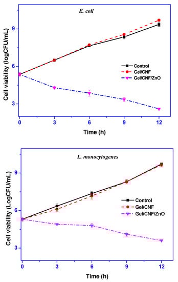 The antimicrobial activity of the ZnONP reinforced film was checked using the colony count method against E. coli and L. monocytogenes, and the results are shown in Figure 5. The gelatin/CNF film antibacterial activity was strongly improved in the presence of ZnONP and the activity was slightly more in case of E. coli than the counterpart, which is presumably owing to the difference in Gram positive and Gram negative cell wall structure [42,43]. Comparable antibacterial activity of ZnONP added CNF film was reported previously [22]. The antibacterial activity of the ZnONP added film was time-dependent. Even though the presence of ZnONP in the film showed good antibacterial activity against both tested foodborne pathogens, the growth of the microbes could not be completely arrested. The relatively low antibacterial activity of the fabricated film was most likely due to the slow release of Zn2+ ions from the gelatin/CNF polymer matrix. Moreover, the ZnONP’s antibacterial activity varies depending on the morphology and fabrication recipe.