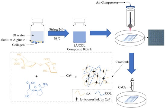 The 7%, 8%, and 9% SA with 0%, 1%, and 2% COL solutions were prepared by dissolving sodium alginate powder and collagen powder in DI water through magnetic stirring for 24 h at 50 °C (Figure 1). Nine SA/COL solutions were prepared for the experiment. The concentration ratios were selected based on preliminary experimental results. The 1% CaCl2/DI water solution was prepared by dissolving calcium chloride anhydrous pellets in DI water and stirring for 5 min.