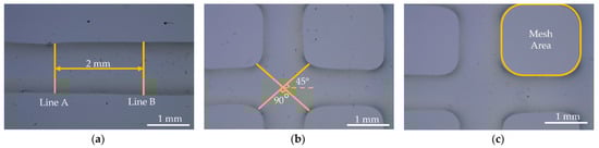 Filament diameters, merged filament sizes, and mesh areas were measured by ImageJ (National Institutes of Health, Bethesda, MD, USA). The upper line and bottom line of each square frame were taken as filament observations. Two points (point A and point B) with a distance of 2 mm were picked randomly from each sample for four-width measurement (Figure 2a). Two grid cells were randomly picked from each sample for four diagonal measurements (Figure 2b) and two mesh area measurements (Figure 2c). Thirty measurements were conducted for each group for filament diameter, merging, and mesh area.