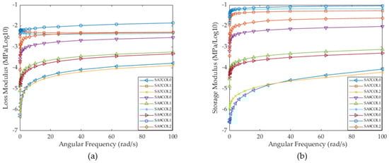 (a) Storage modulus (G′) and (b) loss modulus (G′′).