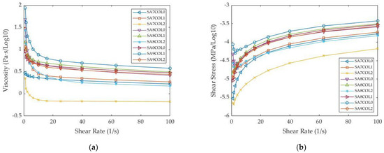 (a) Viscosity-shear rate curve; (b) Shear stress-shear rate curve.