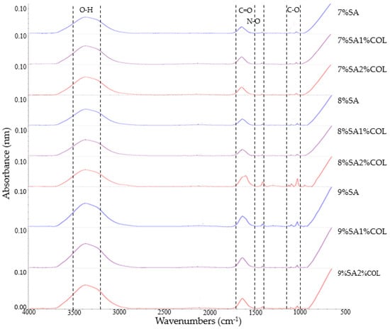 To characterize the chemistry of the SA/COL blends, we analyzed the hydrogels by using FT-IR. As shown in Figure 5, the highest peak at around 3375 cm−1 was due to the alcohol’s phenols (O-H) stretching, which was common in other hydrogel solutions. The two absorption peaks at 1640 cm−1 and 1414 cm−1 were owing to asymmetric stretching by nitro compound (N-O) and stretching by amide (C=O). The ether bond (C-O) stretching vibration led to the peak at 1010 cm−1 and 1032 cm−1. Since the peaks of different solutions were similar, adding COL into the SA solution did not significantly change the hydrogen bond interaction and spectrum absorption, with only a small variation between 1000~1200 cm−1 wavelength. Alternatively, the addition of both SA and COL increased the number of ether bonds, leading to a higher peak than a low concentration solution.