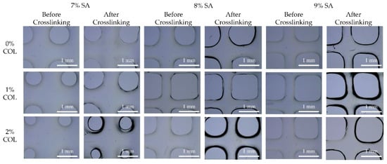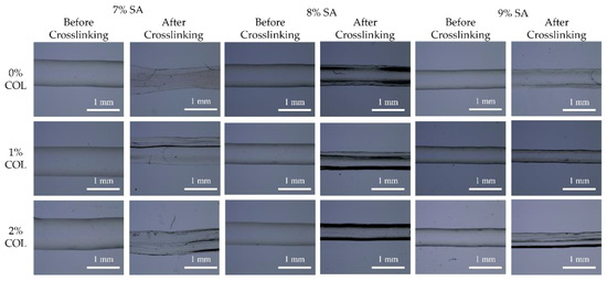 The optical microscope images of printed filaments in Figure 6 showed that the filament diameter seemed to be decreased in higher SA/COL concentration groups before crosslinking. After crosslinking, some of the groups showed distinct layered sections, while some did not. All nine groups were observed with shrinkage in filament size after crosslinking.