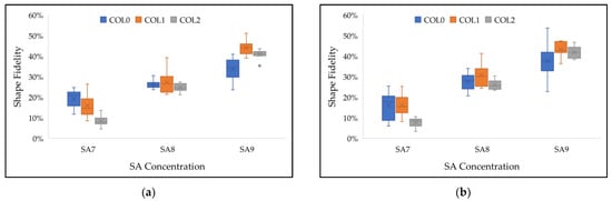 The mesh area was measured to present the shape fidelity of different groups. The ratio of printed mesh area to designed mesh area was shown in Figure 8. The boxplot showed that the shape fidelity of meshes improved by increasing SA concentration. Similar to filament merging, adding COL has interactive effects on mesh areas.