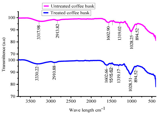 The spectrum of O-H absorption for coffee husk is around 3330.22 and 3317.98 cm−1 for treated and untreated coffee husk, respectively. Untreated coffee husk has a C-H stretching of 2913.82 cm−1, and 10% NaOH-treated coffee husk has a stretching of 2910.88 cm−1. The peaks at 1602.90 and 1602.66 cm−1 in untreated and alkali-treated coffee husk fiber were attributed to C=O stretching vibration of acetyl groups in hemicellulose compounds, as shown in Figure 3. The intensity of the peaks was not observed because coffee husk fibers were treated with 10% NaOH. As a result of the NaOH treatment, the hemicellulose components in the fiber are reduced.