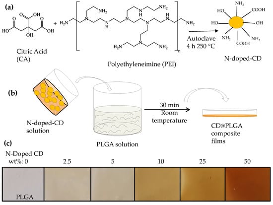 N-doped CDs were synthesized using the hydrothermal method, the best known and frequently used method for CD synthesis, using CA as the carbon source and PEI as the nitrogen source. The characterization of the N-doped CDs was given in our previous study. As shown schematically in Figure 1a, the solution prepared using CA: PEI in a ratio of 1:1 by weight was reacted in a furnace at 250 °C for 4 h to form the N-doped CDs. The N-doped CDs removed from the furnace at the end of the reaction were cooled to room temperature and the resulting yellowish-brown liquid was transferred to the dialysis membrane. It was then washed for 24 h with the water refreshed every 8 h to get rid of unwanted organic molecules. Then, the N-doped CDs were dispersed in chloroform at a concentration of 25 mg/mL. PLGA at a concentration of 50 mg/mL in another vial was dissolved in chloroform for 2 h. After this, the N-doped CDs dispersed in chloroform were incorporated into the PLGA film structure as shown in Figure 1b and mixed for 30 min to ensure that the N-doped CDs were evenly distributed in the PLGA film solution. Then, the CD@PLGA was kept at room temperature for 24 h for film formation.