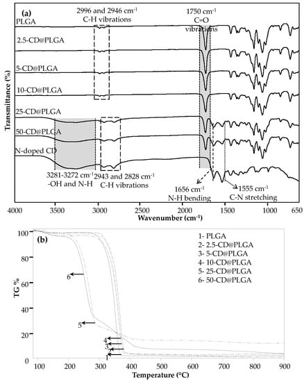 (a) FT-IR spectra of N-doped CD and CD@PLGA with different CD contents, and (b) their corresponding thermograms.
