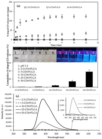 N-doped CDs were synthesized by the hydrothermal method and embedded into the PLGA films in different amounts. The release rate was determined by the degradation of the films via Fluorescence Spectrum at pH 7.4. According to the results given in Figure 3a, all films release N-doped CDs, almost linearly, for up to about 24 h, and the N-doped CDs release continues slowly up to a period of 14 days until a plateau is reached. The N-doped CDs release amounts were 0.05 ± 0.01, 0.07 ± 0.01, 2.2 ± 0.1, 31.2 ± 6.1 and 124.2 ± 9.1 mg/g after 10 days for the 2.5-CD@PLGA, 5-CD@PLGA, 10-CD@PLGA, 25-CD@PLGA and 50-CD@PLGA films, respectively. In addition, the cumulative N-doped CDs release percentages of the films were calculated, and the results are given in Figure 3b. The cumulative N-doped CDs released from the films varied from 0.5 ± 0.04% to 38 ± 5% depending upon the number of N-doped CDs they involved. The Figure 3b inset shows the digital camera images under daylight and the UV light illumination of the samples withdrawn from the PBS release medium. It was observed that the images were transparent under daylight and only the 10-CD@PLGA, 25-CD@PLGA and 50-CD@PLGA films exhibited a bright blue, fluorescent color at 366 nm UV light illumination. With the increasing numbers of N-doped CDs in these films, the bright blue color intensity increases. The fact that the 2.5-CD@PLGA and 5-CD@PLGA films lack fluorescence features is explained by their low N-doped CDs content. What is more, these data for each film sample were fortified by their fluorescence spectrum as demonstrated in Figure 3c. The 2.5-CD@PLGA, 5-CD@PLGA, 10-CD@PLGA, 25-CD@PLGA, and 50-CD@PLGA films have characteristic peaks at 412, 412, 434, 437, 437 and 437 nm, respectively. However, the fluorescence spectra of the films containing different amounts of N-doped CDs indicate that, as the number of N-doped CDs in the CD@PLGA films increased, a gradual increase in the fluorescence intensity of the samples was observed.