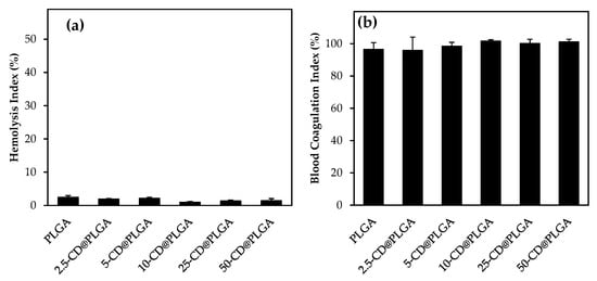 Material hemocompatibility is one of the parameters to consider in biological applications. Hemolysis and blood coagulation tests were conducted to assess the potential use of 10 mg PLGA films in the blood-contact application. Figure 4 shows the hemocompatibility results of films with in vitro hemolysis and blood coagulation tests. According to the hemolysis index results given in Figure 4a, all CD@PLGA and PLGA films are non-hemolytic.