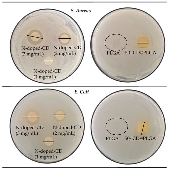 Digital camera images of the zone inhibition diameters on S. aureus and E. coli according to the disc diffusion method for N-doped-CD, PLGA, and 50-CD@PLGA.