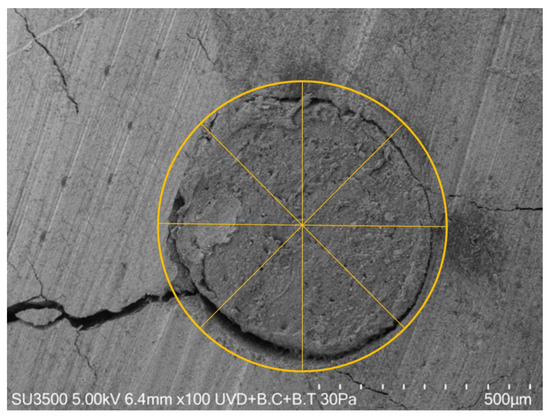 The samples were directly settled onto a carbon planchet stub without a conductive coating and observed with the variable pressure SEM Hitachi SU-3500 (Hitachi Japan), setting the operating conditions at 30 Pa and 5 kV. Images were captured at several magnifications between 50× and 250×. Measurements were carried out on photos at 250× magnification. The marginal gap was measured using ImageJ software (Wayne Rasband; National Institute of Health, Bethesda, MD, USA) according to the methodology proposed by Shokouhinejad et al. [28]. Following this, micrographs obtained from the SEM observation of each tooth section were digitally divided into 8 slices for the measurement of the gap in transverse sections. Precisely, the marginal gaps were evaluated using the freehand selection tool and the line selection tool of ImageJ software at the 8 points selected for the measurements, only after the parameters for measurements had been set correctly using the set scale and the scale bars of the pictures. For each section, the maximum value in terms of distance (µm) between the sealing materials (gutta-percha and/or endodontic sealer) and root canal wall was recorded, and the overall maximum gap value for each specimen was calculated by calculating the average of all the 8 slice values recorded (Figure 1). This procedure was repeated for each section of each tooth. The statistical analysis was then performed considering the overall maximum gap of each sectioned sample.