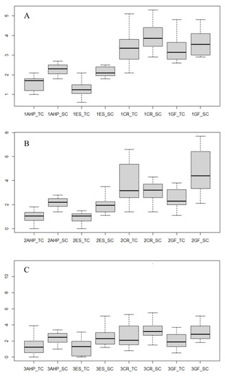 Visual representation of mean values and respective standard deviations of marginal gap measurements (µm) divided according to the endodontic sealer (AH Plus Bioceramic Sealer (AHP), EndoSequence BC Sealer HiFlow (ES), C-Root SP (CR), and GuttaFlow Bioseal (GF)) and the selected obturation technique (single-cone technique (SC) and thermomechanical condensation (TC)). Image (A) shows represented data regarding the marginal gap measured in the root canal apical third; image (B) shows represented data regarding the marginal gap measured in the root canal middle third, whilst image (C) shows represented data regarding the marginal gap measured in the root canal coronal third.