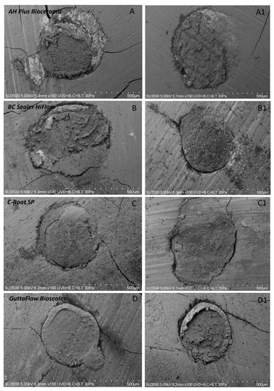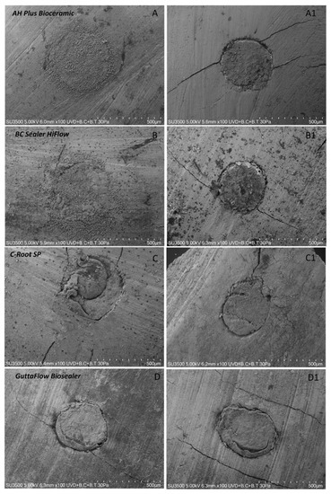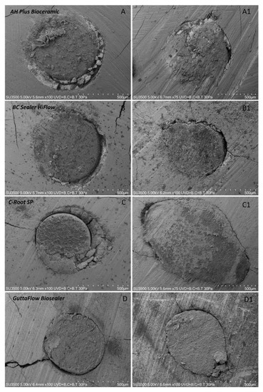 SEM micrographs showing the apical sections of the root canal obturated according to the selected sealer (described in the left column) and the obturation technique used (left column shows single-cone technique, right column shows thermomechanical compaction). (A) AH Plus Bioceramic used with SC technique; (A1) AH Plus Bioceramic used with TC technique; (B) BC Sealer HiFlow used with SC technique; (B1) BC Sealer HiFlow used with TC technique; (C) C-Root SP used with SC technique; (C1) C-Root SP used with TC technique; (D) GuttaFlow Biosealer used with SC technique; (D1) GuttaFlow Biosealer used with TC technique.