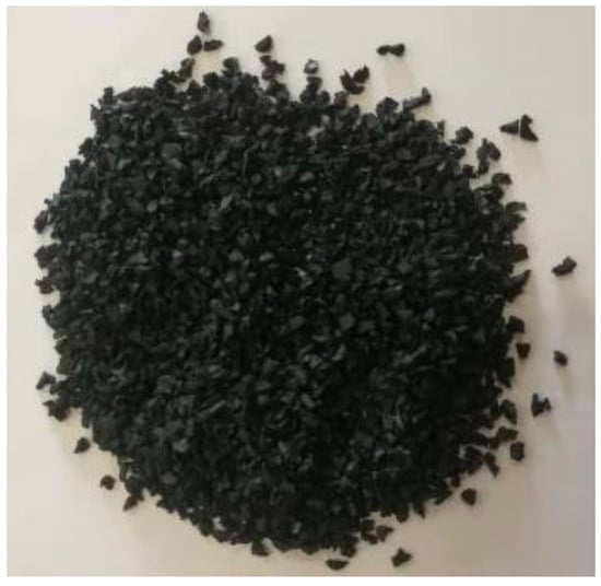Two to four mm of untreated rubber granules (Figure 1) were used to replace 6%, 12%, and 18% of the volume of fine aggregate in ordinary mortar, respectively. Table 1 lists the amount of each material in the three types of CRM samples. The relative density of sand, rubber particles, and cement in Table 1 is 2630 , 1140 , and 3150 , respectively.