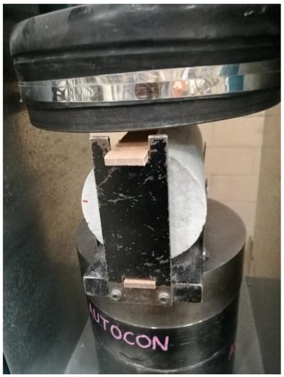 Following the procedure in AS 1012.10 (2000), the indirect tensile test was carried out using an automatic concrete compression testing machine to apply the load at a rate of 0.8 kN/s (Figure 2) [31]. The testing machine was made by CONTROLS Inc. based in Tucker GA, 30084, United States. Under the requirements of ASTM: C-348-20 (1999), the Instron Universal Testing machine was used to perform a three-point flexural test with a loading rate of 0.5 cm/min (Figure 3) [30]. The instrument was made by Instron Engineering Corporation based in Canton, MA, USA. The specimen was simply supported on the testing machine.