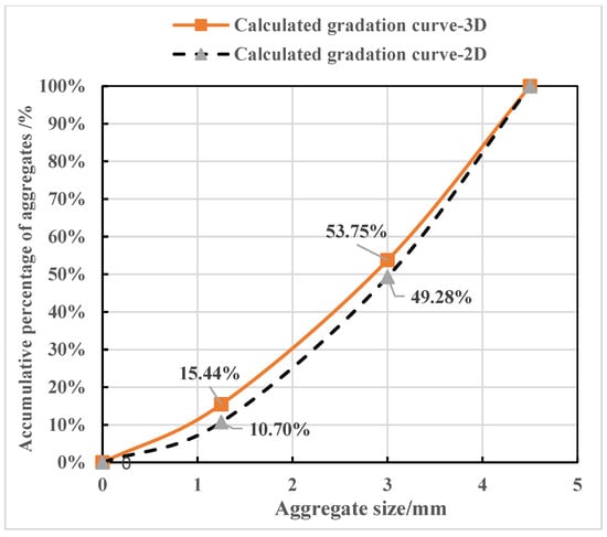 Chen et al. (2021) introduced the procedure of using the Walraven equation to convert the content of rubber particles in a 3D crumb rubber concrete sample to the content on a plane [32]. Similarly, the content of rubber particles on a 2D rubber mortar specimen can also be obtained using the methods they provide, which mainly include three steps. The sand in each size range is assumed to satisfy W.B. Fuller’s grading curve. The first step is to obtain the 3D grade curve of the sand. The size of natural sand in Table 1 is assumed to be in the range of 0.5–5 mm, which is further divided into three ranges of 5–4 mm, 4–2 mm, and 2–0.5 mm to calculate the 3D grading cure of the sand. The equation of W.B. Fuller’s grading curve is used to calculate the volume content of sand in each size range, as shown in Table 2. Figure 4 compares the 3D and 2D gradation curves of the sand with three size ranges. The last step is to determine the rubber content in the 2D state using Equation (1). The results of CRM with five rubber contents are shown in Table 3.