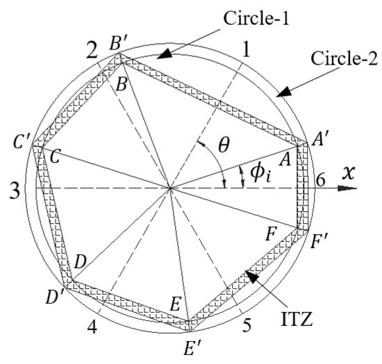 In two-dimensional mesoscale finite element modeling, circles, ellipses, and random polygons are widely used to simulate the shape of coarse aggregates in normal concrete [33]. In this study, circles and circle-derived polygons are adopted to simulate the shape of rubber particles. The thickness of the ITZ between cement and coarse aggregate in conventional concrete is around 15–50 [34]. However, the thickness of the interface layer between the rubber particles and the mortar matrix in rubber concrete or rubber mortar is not found in the available published work. In this study, the thickness of the ITZ in CRM is assumed to be similar to that of ordinary concrete. The thickness of the ITZ is set to 0.05 mm to study its effect on the tensile strength of CRM. Take the circle-derived hexagonal rubber particle as an example to describe how to generate random polygonal rubber particles with six vertexes (Figure 5). Assuming that the diameter of the rubber particles is d, draw the first circle marked “Circle-1”. The six points marked “1”~“6” (Figure 5) are used to equally divide the circumference of “Circle-1”. The first vertex marked “A” is randomly selected between point “1” and point “6”, and the other five vertexes are chosen similarly. The six vertexes marked “A”~“F” are used to connect a sequence to form a random hexagon, and this polygon is offset by 0.05 mm to the outside to obtain the second polygon. The shaded area between these two polygons is the interface layer of the rubber particles in the CRM, as shown in Figure 5. The number of the sides of the random polygons used in this study is set to 4~10, which can be created similarly. In addition to the creation of circular and random circle-derived polygonal particles, other main tasks mainly include determining the random position of aggregates and realizing non-contact between the aggregates, which are provided in [32].