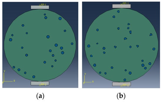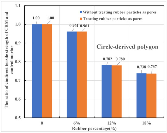 Since the rigidity of rubber is much lower than that of sand, replacing sand with rubber particles is similar to adding the same number of pores to mortar. Therefore, the feasibility of equating rubber particles with pores is studied in this section. CRM models mixed with 2–4 mm rubber particles were first created, and then their rubber particles were replaced by pores to generate reference specimens. The results of these two types of samples are shown in Figure 16, indicating that rubber particles can be regarded as pores when predicting the indirect tensile strength of CRM, and the difference is negligible.