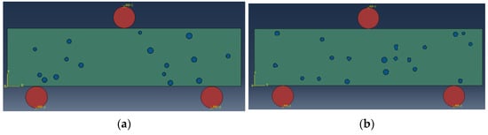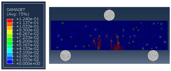 The method described in Section 4.1 was also used to develop a pore-based model to simulate the flexural strength test of the CRM. A 2D sample of CRM12 with rubber particles is shown in Figure 23; these rubber particles are replaced by the same number of pores to generate a pore-based CRM model, as shown in Figure 24. Six models were created for each CRM mixture to obtain theoretical values of flexural strength, and the results are shown in Table 11. In the numerical analysis, the area in which the tensile damage occurs is located at the bottom of the specimen, as shown in Figure 25.