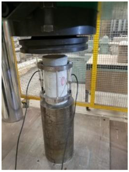 The uniaxial compressive stress–strain curve was estimated from experimental tests using the average from three mortar samples poured with the controlled mix ratio as given in Table 1. A linear variable differential transformer was installed on the specimen to measure and record the vertical displacement in the compression test (Figure 8). The four points in the ascending section and the two points in the descending section are selected as the representative points of the stress–strain curve of each specimen. The average value of the three specimens was calculated to draw the stress–strain curve of normal mortar, as shown in Figure 9. The six points in the curve marked as the “average of three specimens” were substituted into Equation (6) to calculate the compression damage parameters.