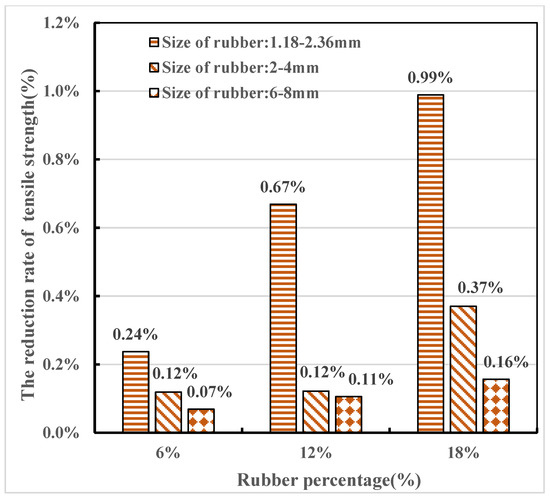 Table 5 shows the tensile strength of the 18 models. First, by comparing the results between the third and fourth columns, it indicates that changing the strength of the ITZ creates a slight decrease in the tensile strength. Figure 12 shows the strength reduction rate of CRMs with different rubber contents and sizes after the ITZ is considered. The strength reduction rate of the CRM due to the ITZ effect increases slightly as the rubber content increases from 6% to 18%. Since the maximum reduction in the tensile strength of the CRM is 0.99%, the presence of the ITZ can be ignored when studying the effect of rubber particles on the tensile strength of the CRM.