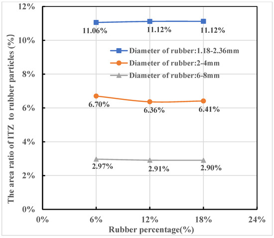 Figure 13 compares the area ratio of the ITZ to rubber particles in the CRM, showing that the area ratio of the ITZ is mainly related to rubber size. As the rubber size decreased from 6–8 mm to 1.18–2.36 mm, the area ratio of the ITZ increased from approximately 2.9% to 11%, suggesting that the use of smaller-sized rubber particles resulted in a larger ITZ area and a slightly greater reduction in tensile strength.