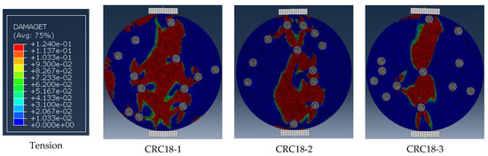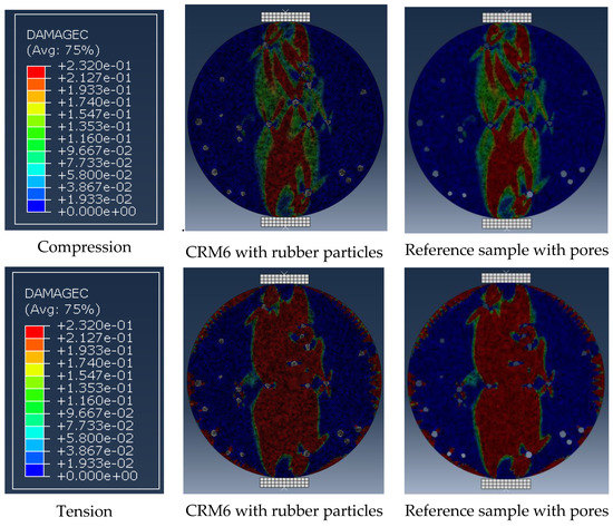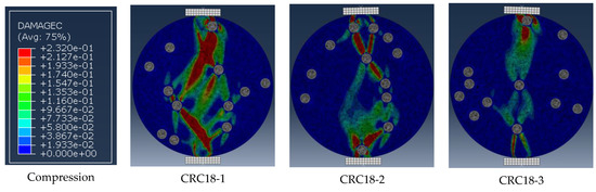 Figure 14 presents the final damage mode of CRM specimens with 7 mm rubber particles, showing that tensile and compressive damage mainly formed in the CRM specimen along its diameter.