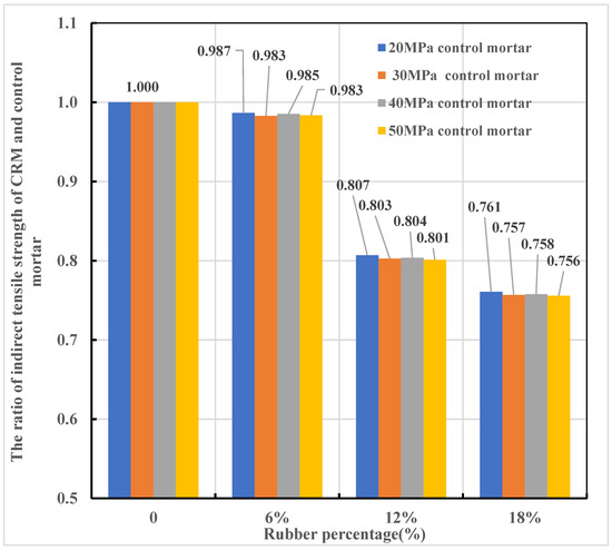The compressive strength of the control mortar is 66.83 MPa (see Table 4), which was multiplied by a number less than 1 to obtain the four strengths including 20 MPa, 30 MPa, 40 MPa, and 50 MPa. These four control mortars were respectively modeled with 2–4 mm rubber particles to form rubber mortar. The indirect tensile strength and Young’s modulus of the four control mortars were obtained similarly. The purpose was to investigate whether the rate of decrease in the tensile strength is related to the strength of the control mortar. The shape of rubber particles in CRM was treated as a circle-derived polygon. The ratio of the indirect tensile strength between the CRM and the control mortar is shown in Figure 15, indicating that the strength reduction rate is not affected by the strength of the control mortar, but is related to the rubber content.