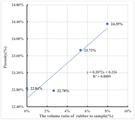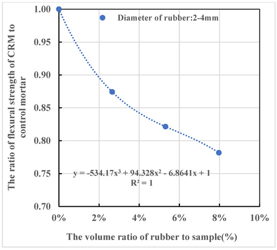 where is the ratio of the flexural strength of the CRM and the control mortar, is the volume ratio of rubber to the sample, and is the increased porosity of CRM over the control mortar, which can be calculated based on Equation (9).