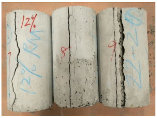 In the indirect tensile tests, the cylindrical specimen is loaded radially along its diameter, as shown in Figure 19. Three samples for each mixture were cast to test the indirect tensile strength of CRM, and their average was taken as the experimental value. The results of CRM samples are listed in Table 8.