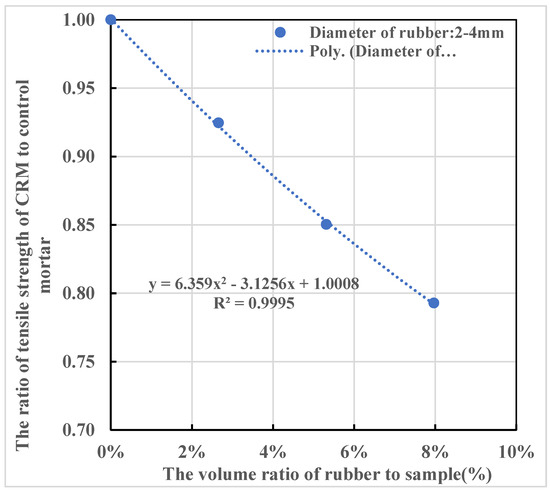 Based on the numerical results from Table 7 in Section 3.2.4, the best-fitting curve of the average tensile strength of CRM and rubber content is shown in Figure 20. Equation (9) shows that the porosity of the CRM is larger than the control mortar. To consider the effect of the increased porosity, the equation of the curve should be modified as