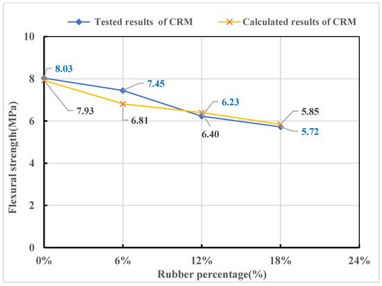 Calculated values of flexural strength for CRMs with three rubber contents were obtained using Equation (11).