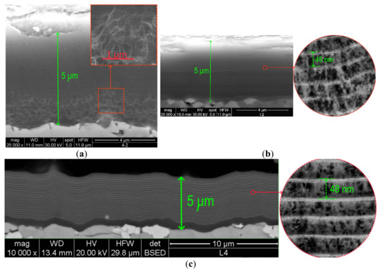 The ZrN coating has a monolithic structure, with average grain sizes of 200–500 nm (Figure 1a). The coatings of (Ti,Cr,Al)N and (Zr,Mo,Al)N have a nanolayered structure with the modulation periods of 45 and 48 nm, respectively (Figure 1b,c). The total thickness of each of the considered coatings reaches about 5 µm.