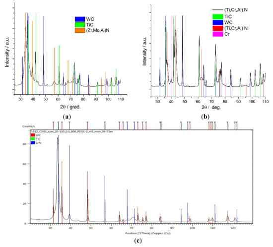 Investigation of the phase composition of the coatings, conducted by the X-ray diffraction (XRD) technique: (a) Zr-ZrN-(Zr,Mo,Al)N, (b) Ti-TiN-(Ti,Cr,Al)N, and (c) ZrN. The WC and TiC phases of the carbide substrate are also detected.