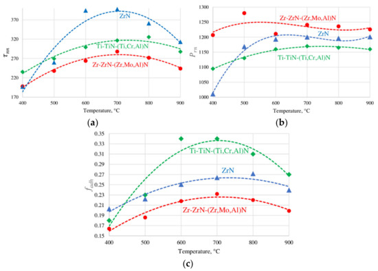 The studies of the tribological properties of the coatings under consideration prove there are noticeable differences in the change in these properties for various coatings depending on temperatures (Figure 3). Given the shear strength of adhesive bonds τnn, the most favorable properties are detected for the coating of (Zr,Mo,Al)N, which also exhibits the maximum value of normal stresses Prn, which characterizes the deformation component of friction. As a result, the coating of (Zr,Mo,Al)N has the minimum value of the adhesion component of the COF fadh over the entire temperature range under consideration. The coating of (Ti,Cr,Al)N exhibits high values of the shear strength of adhesive bonds τnn. The studies are carried out for the tribological pairs, in which the contacting material is Inconel 718 alloy, containing a significant amount of chromium (about 20% [1,2,3]), and this fact may explain the higher shear strength of adhesive bonds τnn for the coating of (Ti,Cr,Al)N. Meanwhile, the value of normal stresses Prn for the coating of (Ti,Cr,Al)N is noticeably lower in comparison with that for the coating of (Zr,Mo,Al)N, which in combination with the higher value of τnn leads to a less favorable value of fadh, especially in the temperature range of 600–700 °C. The indicated temperatures do not lead to any noticeable formation of a tribologically active oxide of Al2O3, the active formation of which starts at a temperature of 900 °C [41,63]. In contrast to the coatings with nanolayered structures considered above, the monolithic coating of ZrN exhibited a noticeable growth in τnn with an increase in temperature up to 700 °C and then the equally noticeable decrease in this parameter with a further increase in temperature. The coating of ZrN also exhibits a noticeable increase in its value of normal stresses Prn with an increase in the temperature from 400 to 500 °C, which may occur due to the thermal hardening of the coating. As a result, in the temperature range of 600–900 °C, the coating of ZrN has a lower value of fadh in comparison with the value of fadh for the coating of (Ti,Cr,Al)N.