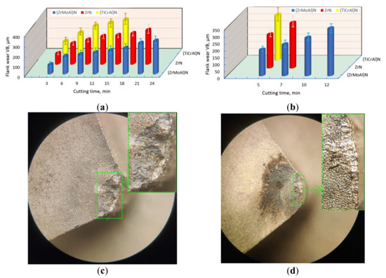 Relationship between the flank wear VB and the cutting time during the turning of Inconel 718 at various cutting speeds: (a) vc = 125 m/min and (b) vc = 200 m/min. View of the worn rake face of a tool coated with (c) (Ti,Cr,Al)N and (d) (Zr,Mo,Al)N, vc = 200 m/min.