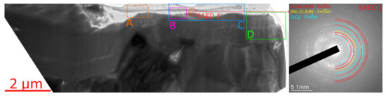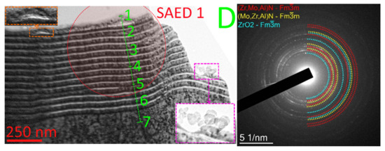 The examination of the external layers of the preserved part of the coating (Figure 7) (without taking into account the delaminated layers) reveals the presence of the phases similar to those found in the delaminated part of the coating (see Figure 5). There are cubic phases of c-(Zr,Mo,Al)N and c-(Mo,Zr,Al)N, as well as the oxide phase of ZrO2. The EDX analysis of the chemical composition of the coating (Line L1) detects the diffusion of oxygen into the coating to the depth not exceeding 250 nm.