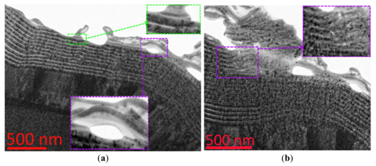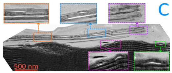 Figure 6 exhibits in detail the structure of the delaminated layers of the coating. The oxidation occurring under the influence of elevated temperatures results not only in delamination between the coating nanolayers but also in a typical arch deformation in separate sections of the coating nanolayers. These deformations can be associated both with the effect of temperature and with the noticeable difference in density between ZrN (7.09; 7.3 g/cm3) and ZrO2 (5.68 g/cm3) [68].