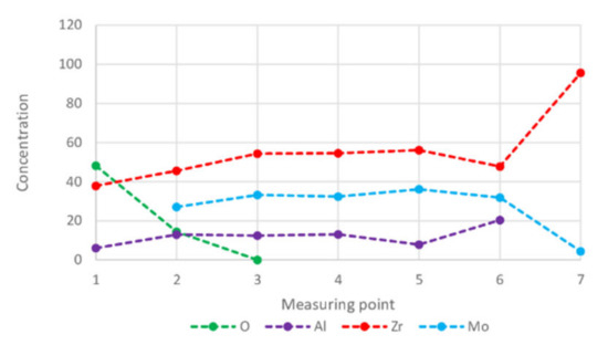 Since the coating of (Zr,Mo,Al)N provided for the minimum value of the adhesion component of the COF fadh and the longest tool life at the cutting speeds of vc = 125 m/min and especially vc = 200 m/min (with the assumed dominance of the oxidation wear mechanism [18,19,20]), the mechanism of oxidation processes in the coating of (Zr,Mo,Al)N at various cutting speeds is considered in more detail.