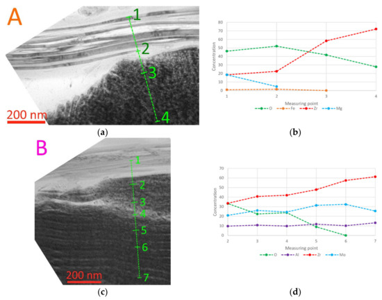 Investigation of the depth of oxygen diffusion into the structure of the (Zr,Mo,Al)N coating. Localization of the study areas A (a,b) and B (c,d) is exhibited in Figure 5.