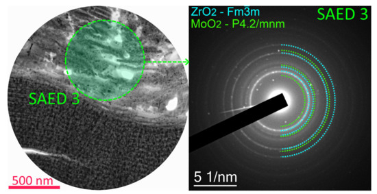 The SAED analysis of the oxidized part of the coating detects almost complete oxidation. No initial cubic phases, but only oxide phases—oxides of zirconium ZrO2 and molybdenum MoO2—are detected (Figure 10). Oxide coatings (in particular, Al2O3, TiO2, ZrO2) have a beneficial effect on the cutting process, changing the tribological parameters in the cutting zone and reducing heat generation [71,72,73]. It should be noted that no oxides of molybdenum were detected in the worn areas of the coating after the machining at the cutting speed of vc = 125 m/min.