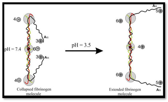 By estimating the charge distribution of a fibrinogen molecule under physiological, acidic, and basic pH values, Adamczyk et al. [36] predicted the angles between the Aα and the main body of a fibrinogen molecule. The angles were 56° at pH of 7.4 and 115° at pH < 4 and pH > 10. These angles highlight that fibrinogen has a compact conformation at neutral pH; however, the Aα arms expand outward as the pH becomes more acidic or basic. Weisel and Medved [45] used microcalorimetry and electron microscopy to show that under neutral pH, αC domains interact with the E domain; however, under acidic conditions, these interactions are dissociated and αC domains stretch outward.